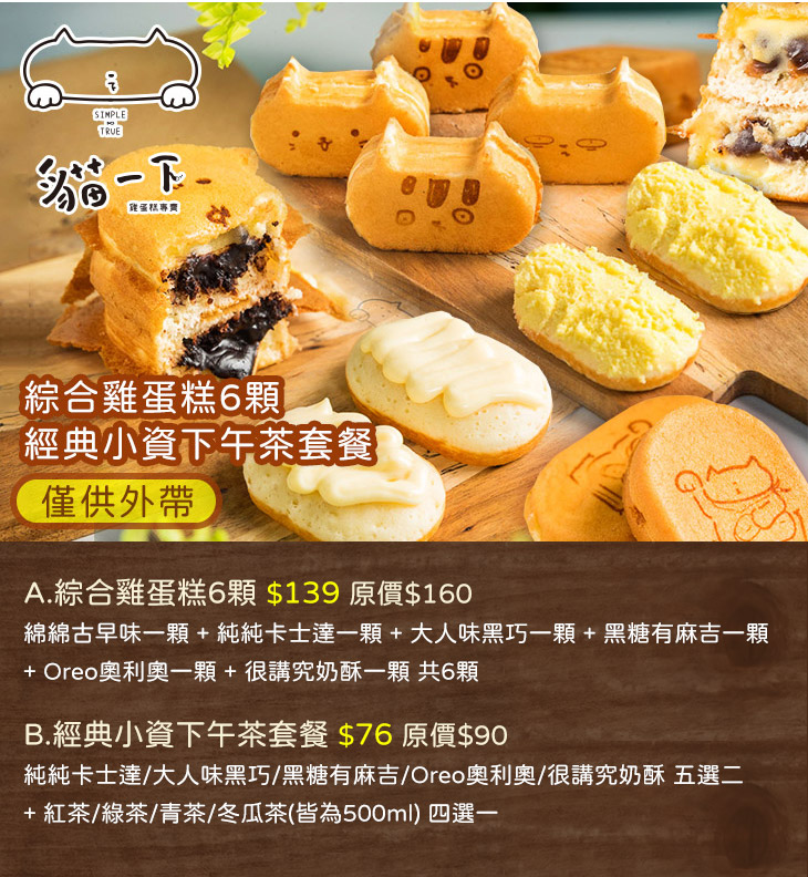 主打貓咪造型的雞蛋糕,可愛逗趣的外表深深擄獲顧客們的心,讓人忍不住少女心噴發,看了超療癒!【貓一下雞蛋糕】堅持每日現打麵糊,選用新鮮食材,僅以雞蛋、麵粉與純牛奶製作出一個個單純又美味的雞蛋糕,並且減糖少油,讓您吃得安心又無罪惡感,絕對值得您蒞臨造訪,細細品嚐一番。