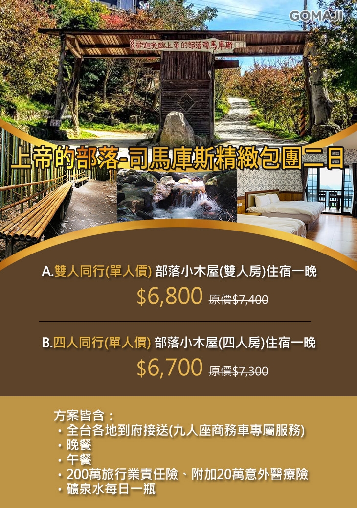 不必擔心舟車勞頓,由專人護送您直達-「上帝的部落」,讓您可以在顛簸的路途中安心熟睡,適合相揪好友或家人們一同出遊!位於新竹尖石的泰雅族部落-「司馬庫斯」,海拔約1500公尺,是最深山的原住民部落,保留了泰雅族文化以及山林最原始的樣貌,值得您深度探索、細細品味~在喧囂擁擠的城市待久了,偶爾需要放鬆一下,不妨來一場洗滌心靈的慢活之旅吧!另此方案提供小木屋住宿,還有風味獨具的午餐及晚餐,保證讓您值回票價、玩得不亦樂乎唷!