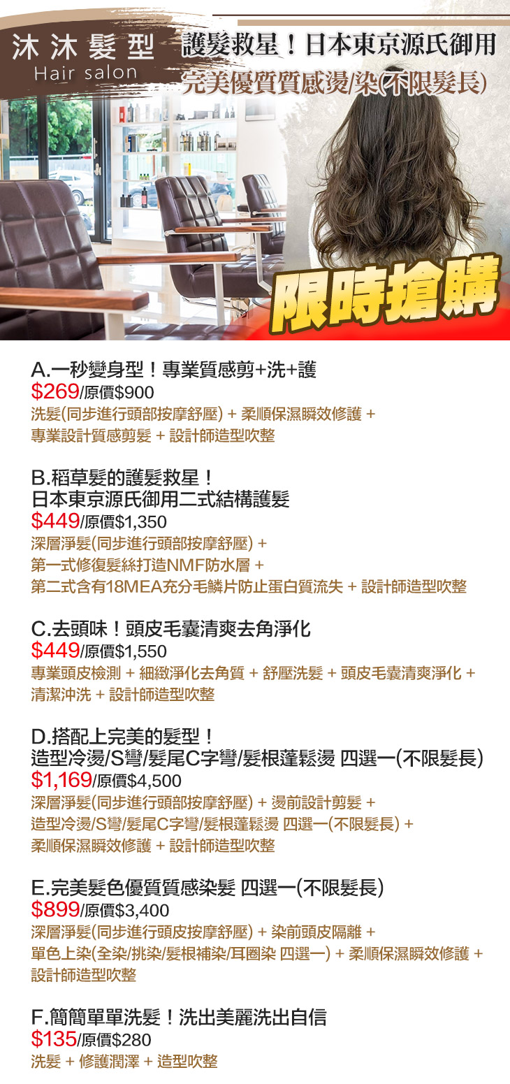 A.一秒變身型!專業質感剪+洗+護 / B.稻草髮的護髮救星!日本東京源氏御用二式結構護髮 / C.去頭味!頭皮毛囊清爽去角淨化 / D.搭配上完美的髮型!造型冷燙/S彎/髮尾C字彎/髮根蓬鬆燙 四選一(不限髮長) / E.完美髮色優質質感染髮 四選一(不限髮長) / F.簡簡單單洗髮!洗出美麗洗出自信