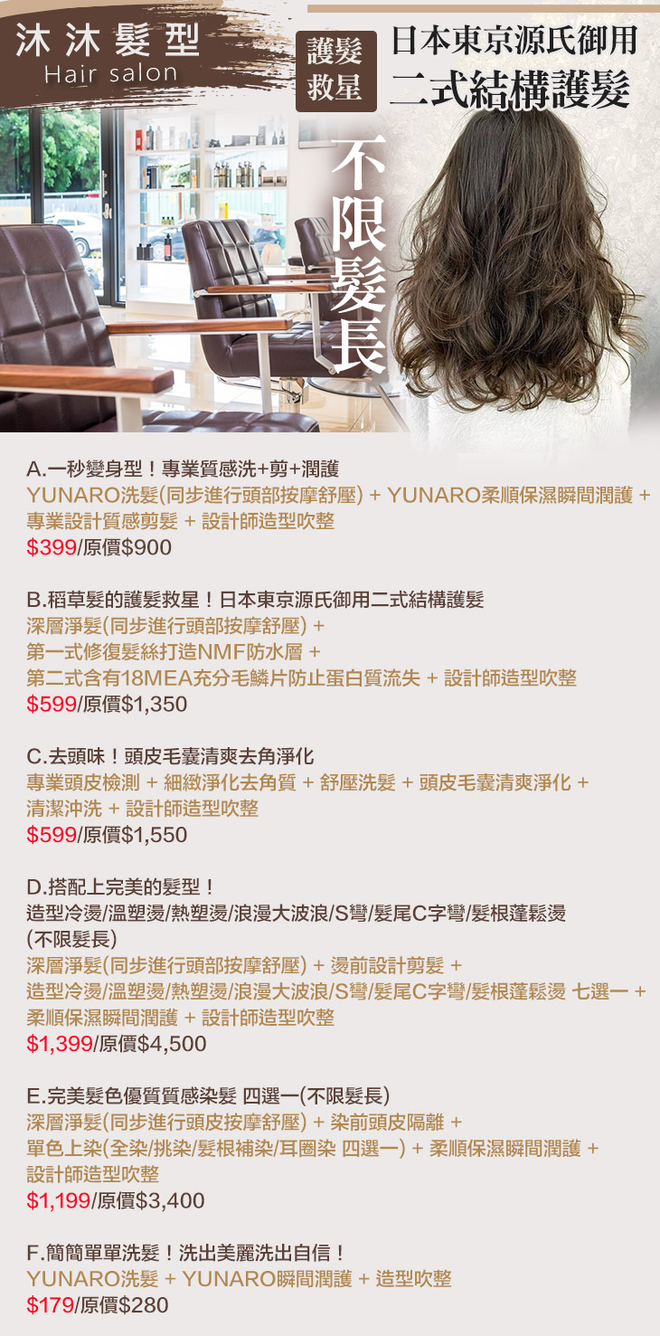 A.一秒變身型!專業質感洗+剪+潤護 / B.稻草髮的護髮救星!日本東京源氏御用二式結構護髮 / C.去頭味!頭皮毛囊清爽去角淨化 / D.搭配上完美的髮型!造型冷燙/溫塑燙/熱塑燙/浪漫大波浪/S彎/髮尾C字彎/髮根蓬鬆燙(不限髮長) / E.完美髮色優質質感染髮 四選一(不限髮長) / F.簡簡單單洗髮!洗出美麗洗出自信!