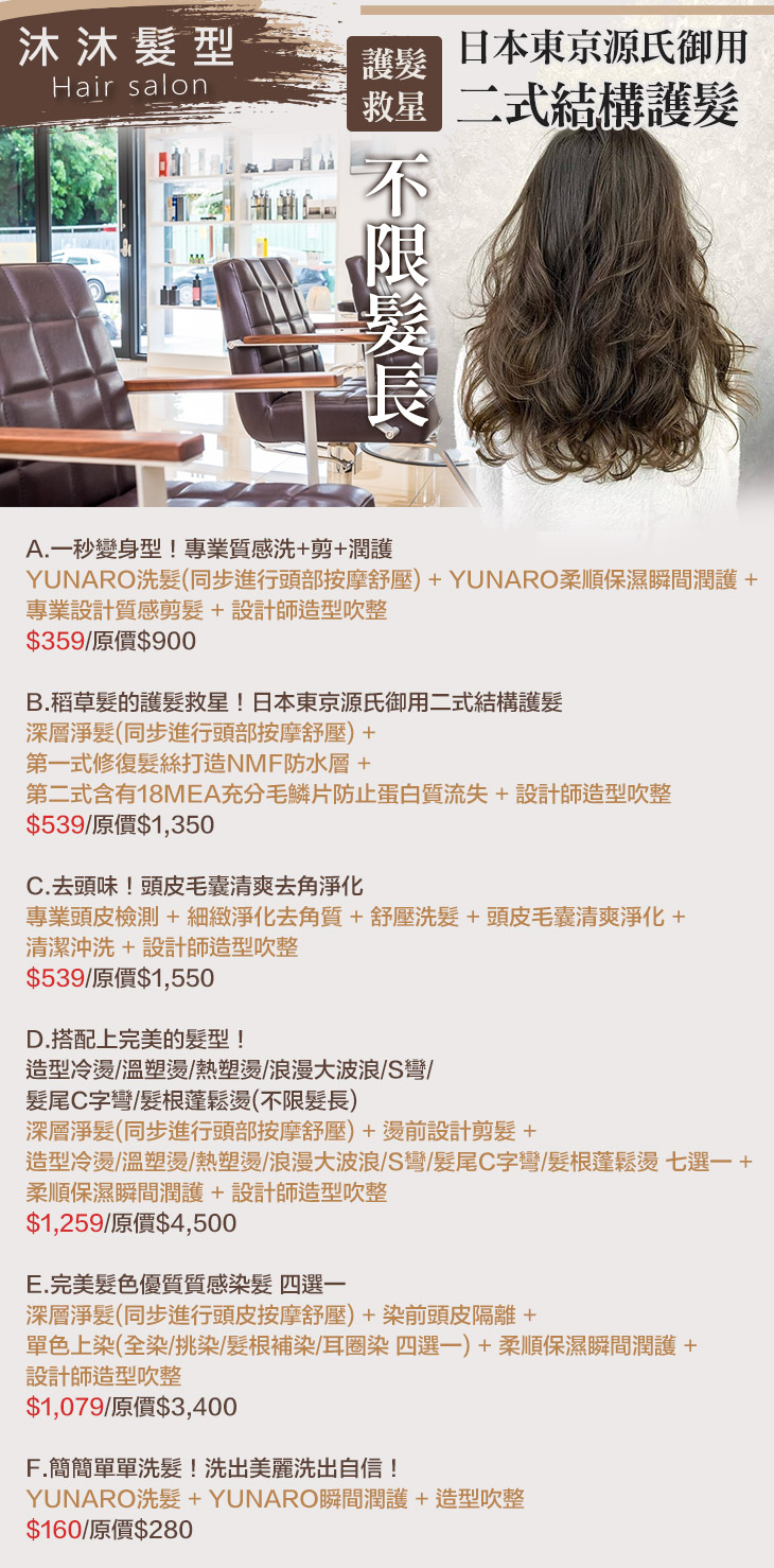 A.一秒變身型!專業質感洗+剪+潤護 / B.稻草髮的護髮救星!日本東京源氏御用二式結構護髮 / C.去頭味!頭皮毛囊清爽去角淨化 / D.搭配上完美的髮型!造型冷燙/溫塑燙/熱塑燙/浪漫大波浪/S彎/髮尾C字彎/髮根蓬鬆燙(不限髮長) / E.完美髮色優質質感染髮 四選一 / F.簡簡單單洗髮!洗出美麗洗出自信!
