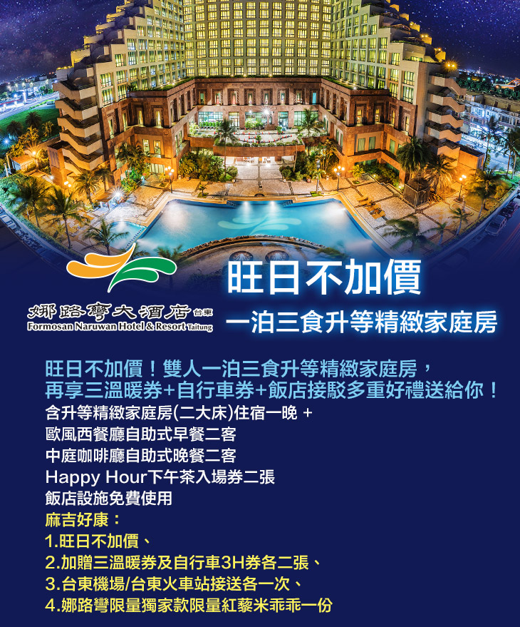★雙人一泊三食升等精緻家庭房,提供豐盛自助式早餐、晚餐及下午茶再加贈三溫暖券,出遊台東住宿首選。