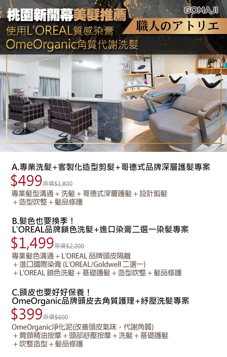A.專業洗髮+客製化造型剪髮+哥德式品牌深層護髮專案 / B.髮色也要換季!L'OREAL品牌鎖色洗髮+進口染膏二選一染髮專案 / C.頭皮也要好好保養!OmeOrganic品牌頭皮去角質護理+紓壓洗髮專案