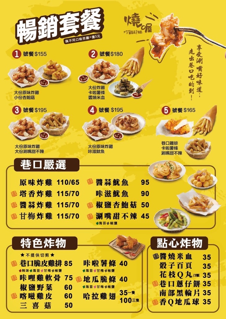與固定廠商批貨,確保食材的品質與產源!再結合自家獨門秘方,讓炸物嚐起來除了必備的酥脆香,口感更是與一般市售的有些許不一樣!不但不油膩,更添一股難以言喻的滋味,讓老饕您首次品嚐便敗倒於它的魅力之下!