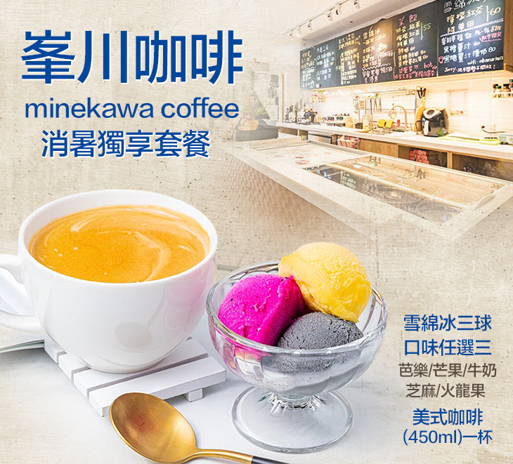 本店提供新鮮美味、入口即化的雪綿冰予顧客,您可搭配嚴選的優質咖啡一同享用,無論何時前來都將能找到專屬於自己的快樂,心情鬱悶時、想找個地方獨處時,不妨來到鬧中取靜的【峯川咖啡】,藉由雪綿冰、咖啡和靜謐的空間,帶您暫時遠離城市的喧囂,徹底地沉浸在與自我對話的悠閒時光裡吧!