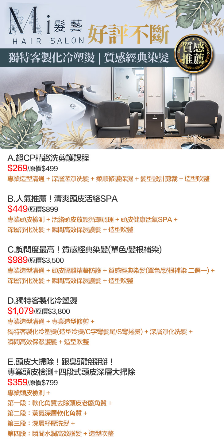 A.超CP精緻洗剪護課程 / B.人氣推薦!清爽頭皮活絡SPA / C.詢問度最高!質感經典染髮(單色/髮根補染) / D.獨特客製化冷塑燙 / E.頭皮大掃除!跟臭頭說掰掰!專業頭皮檢測+四段式頭皮深層大掃除