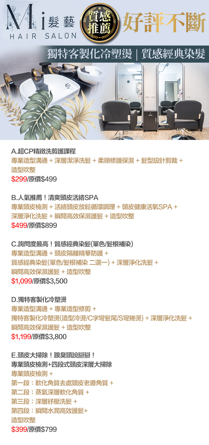 A.超CP精緻洗剪護課程 / B.人氣推薦!清爽頭皮活絡SPA / C.詢問度最高!質感經典染髮(單色/髮根補染) / D.獨特客製化冷塑燙 / E.頭皮大掃除!跟臭頭說掰掰!專業頭皮檢測+四段式頭皮深層大掃除