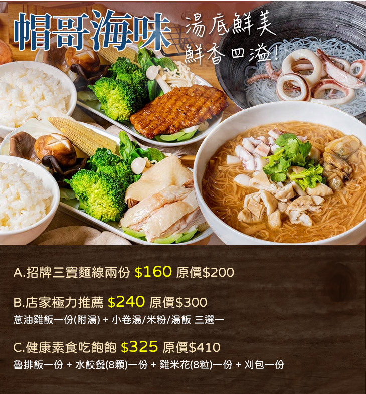 〝獨樹一格的美味-帽哥海味〞老闆帽哥因轉職而踏入餐飲業,在因緣際會接觸淡菜後,研發特色主打湯底鮮美的麵線料理,以淡菜為基底熬製的湯頭,清香的鮮甜,加上經典滑嫩台式麵線,將您我記憶中的美味翻新,讓您品味新穎的口感,滿足您的味蕾!店內豐富多樣的菜單充滿各種海味,有別於一般的餐館,加上那親民樸實的價位,絕對是您吃過最多元、最特別的小吃佳餚!
