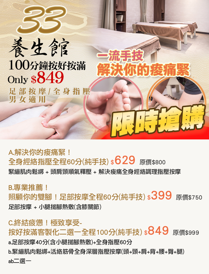 A.解決你的痠痛緊!全身經絡指壓全程60分(純手技) / B.專業推薦!照顧你的雙腳!足部按摩全程60分(純手技) / C.終結疲憊!極致享受-按好按滿客製化二選一全程100分(純手技)