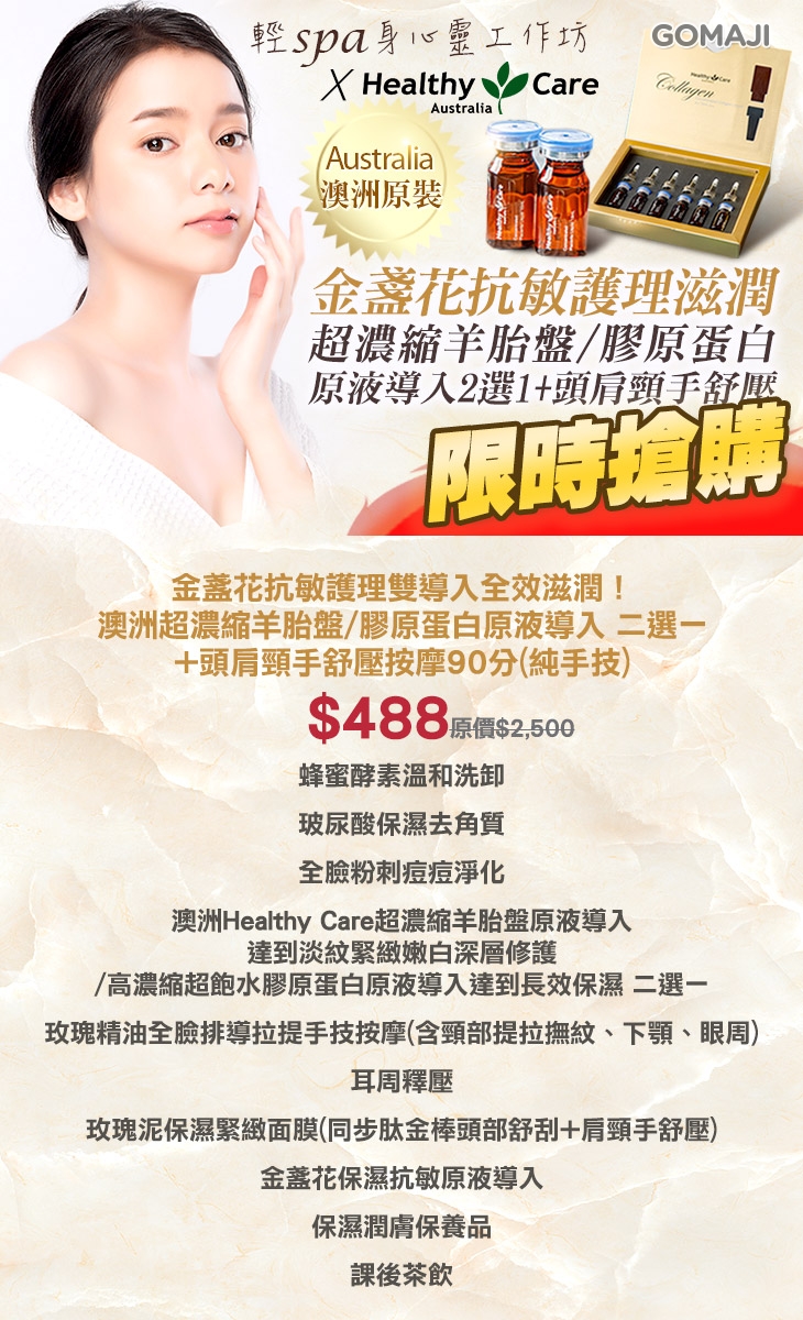 金盞花抗敏護理雙導入全效滋潤!澳洲超濃縮羊胎盤/膠原蛋白原液導入 二選一+頭肩頸手舒壓按摩90分(純手技)