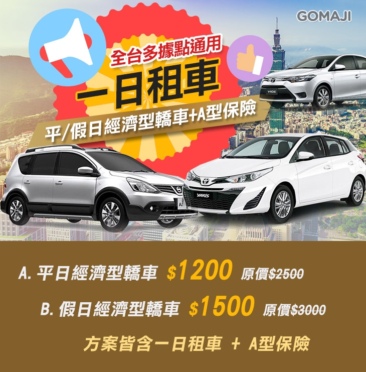 〈含A.平日/B.假日經濟型轎車一日租車 + A型保險〉