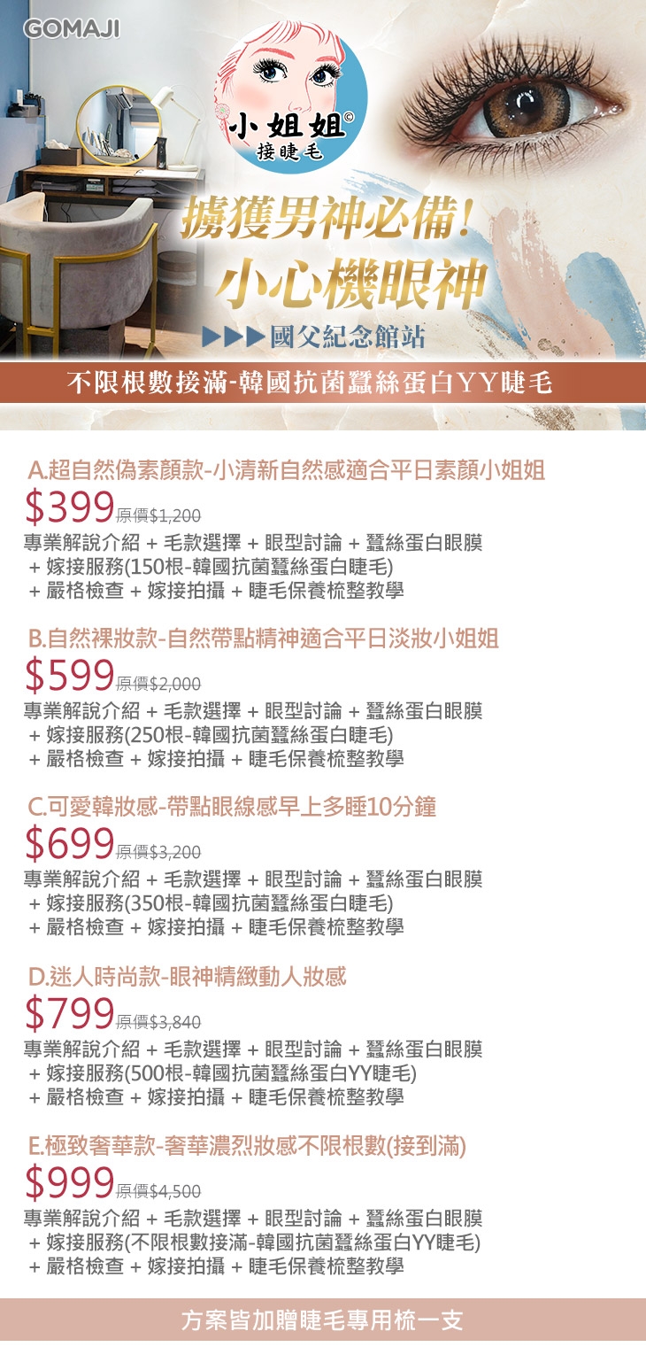 〈專業解說介紹 + 毛款選擇 + 眼型討論 + 蠶絲蛋白眼膜 + 嫁接服務(不限根數接滿-韓國抗菌蠶絲蛋白YY睫毛) + 嚴格檢查 + 嫁接拍攝 + 睫毛保養梳整教學〉加贈睫毛專用梳一支