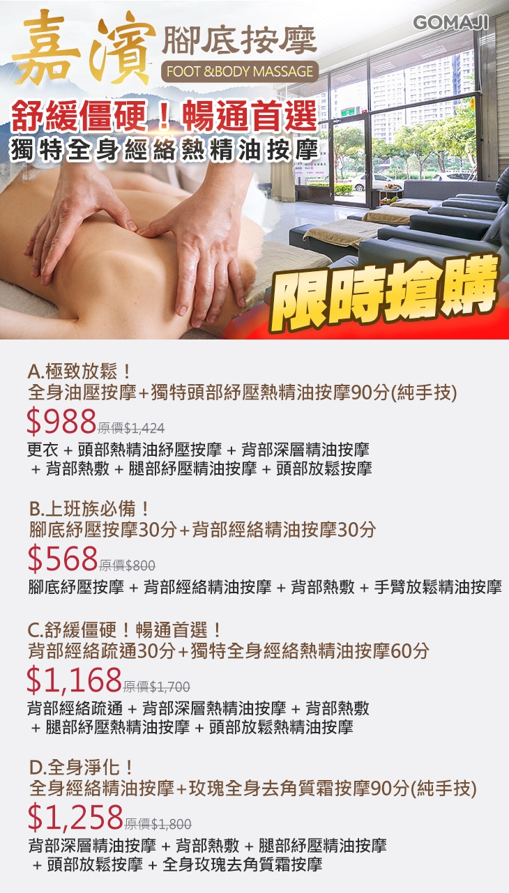 A.極致放鬆!全身油壓按摩+獨特頭部紓壓熱精油按摩90分(純手技) / B.上班族必備!腳底紓壓按摩30分+背部經絡精油按摩30分 / C.舒緩僵硬!暢通首選!背部經絡疏通30分+獨特全身經絡熱精油按摩60分 / D.全身淨化!全身經絡精油按摩+玫瑰全身去角質霜按摩90分(純手技)