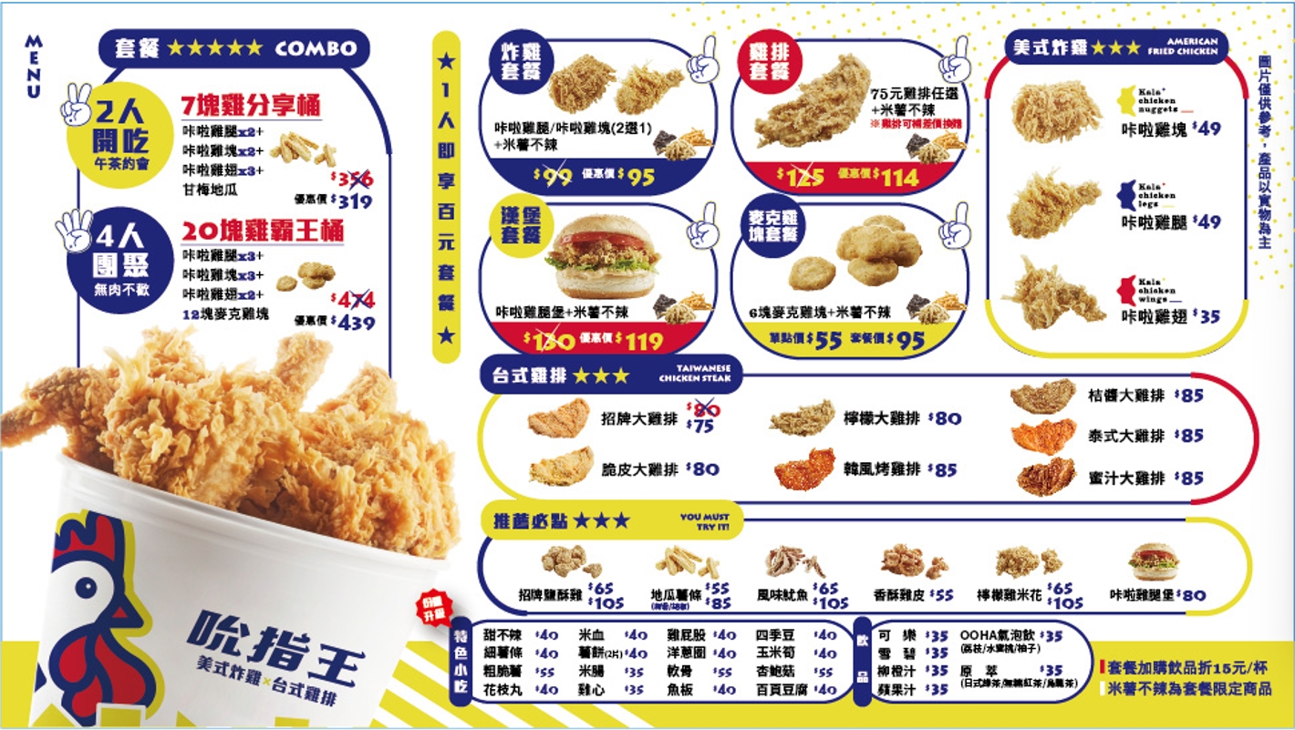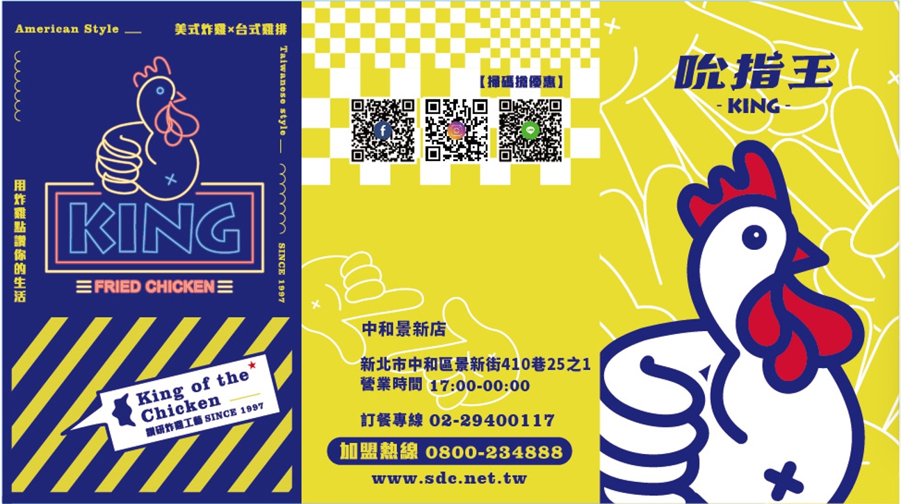 美式炸雞X台式雞排的最佳代表!創立於1997年,各大媒體爭相報導,口碑、人氣直逼破表的「吮指王KING」正式上線!提供多樣化的組合及口味任君挑選,CP值超高,餐點的品質更是無庸置疑,銷魂級的美味保證讓您一吃再吃、吮指回味。此次僅適用於「中和景新店」,鄰近MRT南勢角站,是中和麻吉們的專屬優惠唷~走過、路過,千萬別錯過啦!趁著優惠檔期,把想吃的品項通通點上,大快朵頤一場吧!