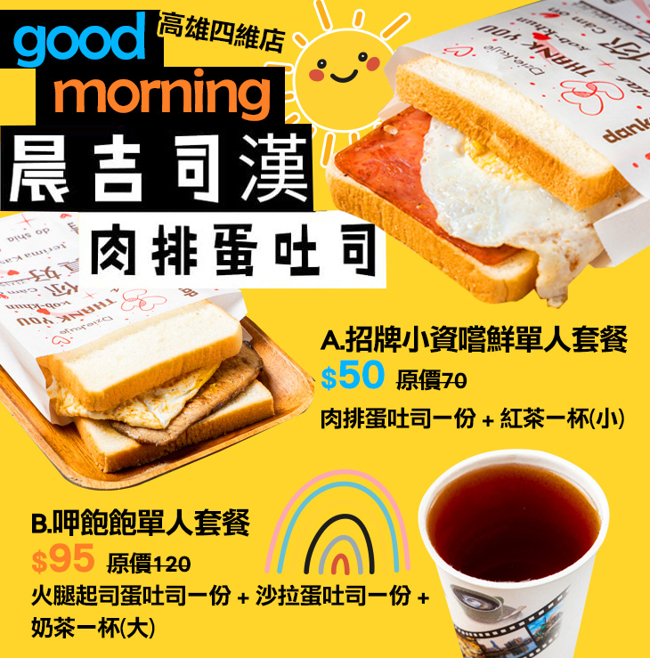 超人氣的連鎖品牌登場啦!是專屬於高雄麻吉們的特別優惠唷~秉持著創新、精緻、快速、用心、美味、永續和健康的理念,堅持選用合格標準的原型食材,使用當日配送的晨光吐司、保證優質的營養雞蛋,加上精心調味的秘製里肌肉排,組合成眾人垂涎的「肉排蛋吐司」,並推出更多精選口味,希望藉此帶給顧客美好的味覺饗宴,迎來元氣滿滿的晨間時光~