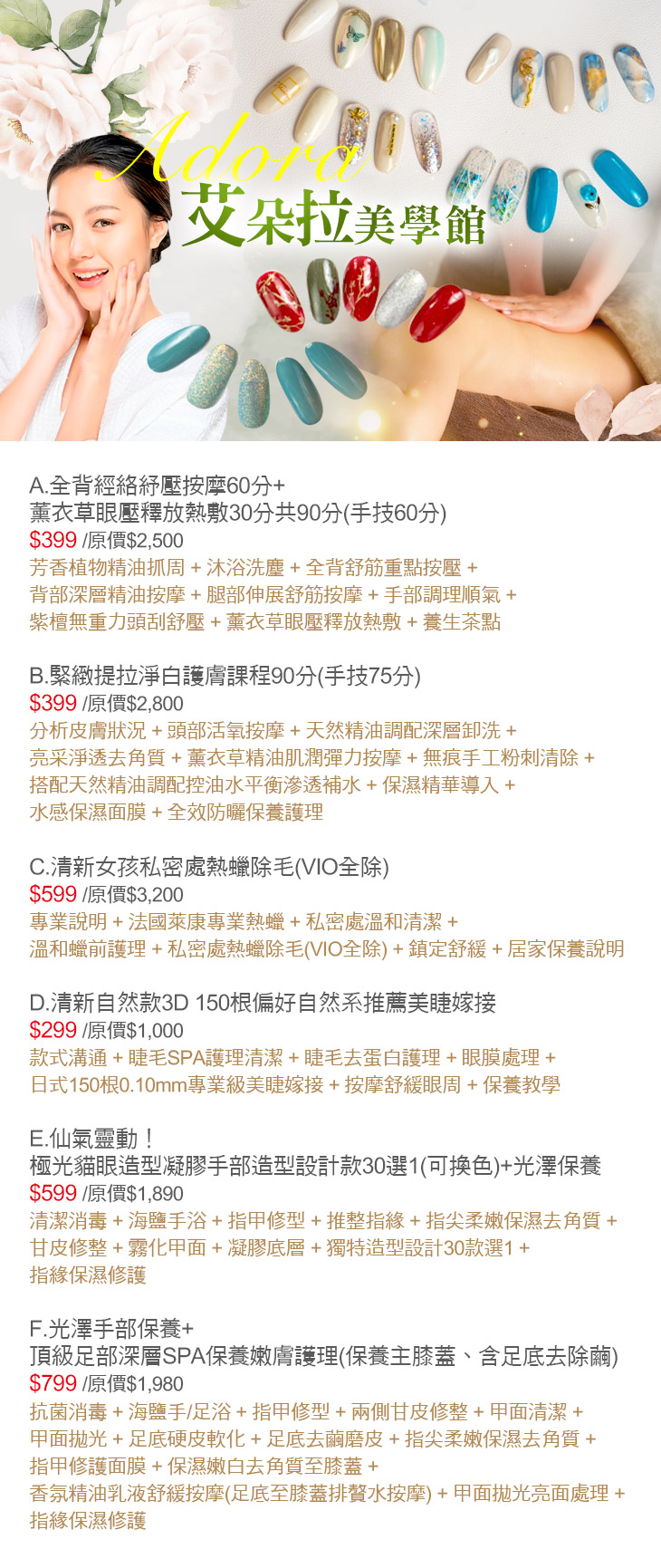 A.全背經絡紓壓按摩60分+薰衣草眼壓釋放熱敷30分共90分(手技60分) / B.緊緻提拉淨白護膚課程90分(手技75分) / C.清新女孩私密處熱蠟除毛(VIO全除) / D.清新自然款3D 150根偏好自然系推薦美睫嫁接 / E.仙氣靈動!極光貓眼造型凝膠手部造型設計款30選1(可換色)+光澤保養 / F.光澤手部保養+頂級足部深層SPA保養嫩膚護理(保養主膝蓋、含足底去除繭)