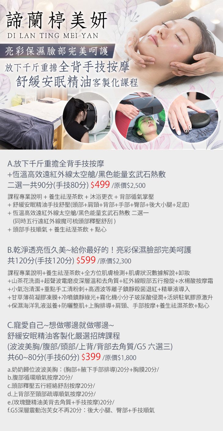 A.放下千斤重擔全背手技按摩+恆溫高效遠紅外線太空艙/黑色能量玄武石熱敷 二選一共90分(手技80分) / B.乾淨透亮恆久美~給你最好的!亮彩保濕臉部完美呵護共120分(手技120分) / C.寵愛自己~想做哪邊就做哪邊~舒緩安眠精油客製化嚴選招牌課程(波波美胸/腹部/頭部/上背/背部去角質/G5 六選三)共60~80分(手技60分)