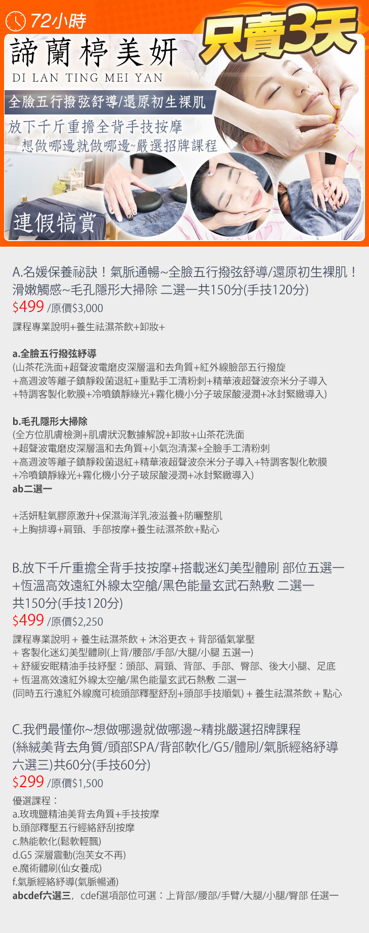 A.名媛保養祕訣!氣脈通暢~全臉五行撥弦舒導/還原初生裸肌!滑嫩觸感~毛孔隱形大掃除 二選一共 150分(手技120分) / B.放下千斤重擔全背手技按摩+搭載迷幻美型體刷 部位五選一+恆溫高效遠紅外線太空艙/黑色能量玄武石熱敷 二選一共150分(手技120分) / C.我們最懂你~想做哪邊就做哪邊~精挑嚴選招牌課程(絲絨美背去角質/頭部SPA/背部軟化/G5/體刷/氣脈經絡紓導 六選三)共60分(手技60分)