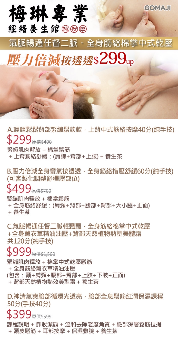 A.輕輕鬆鬆背部緊繃鬆軟軟.上背中式筋絡按摩40分(純手技) / B.壓力倍減全身鬱氣按透透.全身筋絡指壓舒緩60分(純手技)(可客製化調整舒釋壓部位) / C.氣脈暢通任督二脈輕飄飄.全身筋絡棉掌中式乾壓+全身薰衣草精油油壓+背部天然植物熱效美型霜 共120分(純手技) / D.神清氣爽臉部循環光透亮.臉部全息鬆筋紅潤保濕課程50分(手技40分)
