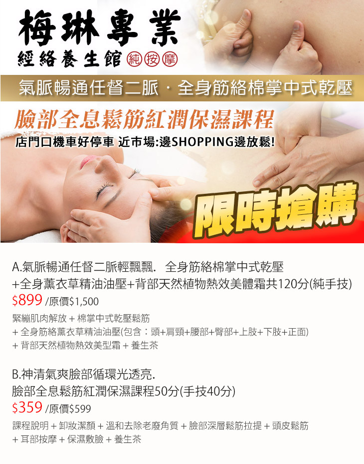 A.氣脈暢通任督二脈輕飄飄.全身筋絡棉掌中式乾壓+全身薰衣草精油油壓+背部天然植物熱效美體霜共120分(純手技) / B.神清氣爽臉部循環光透亮.臉部全息鬆筋紅潤保濕課程50分(手技40分)