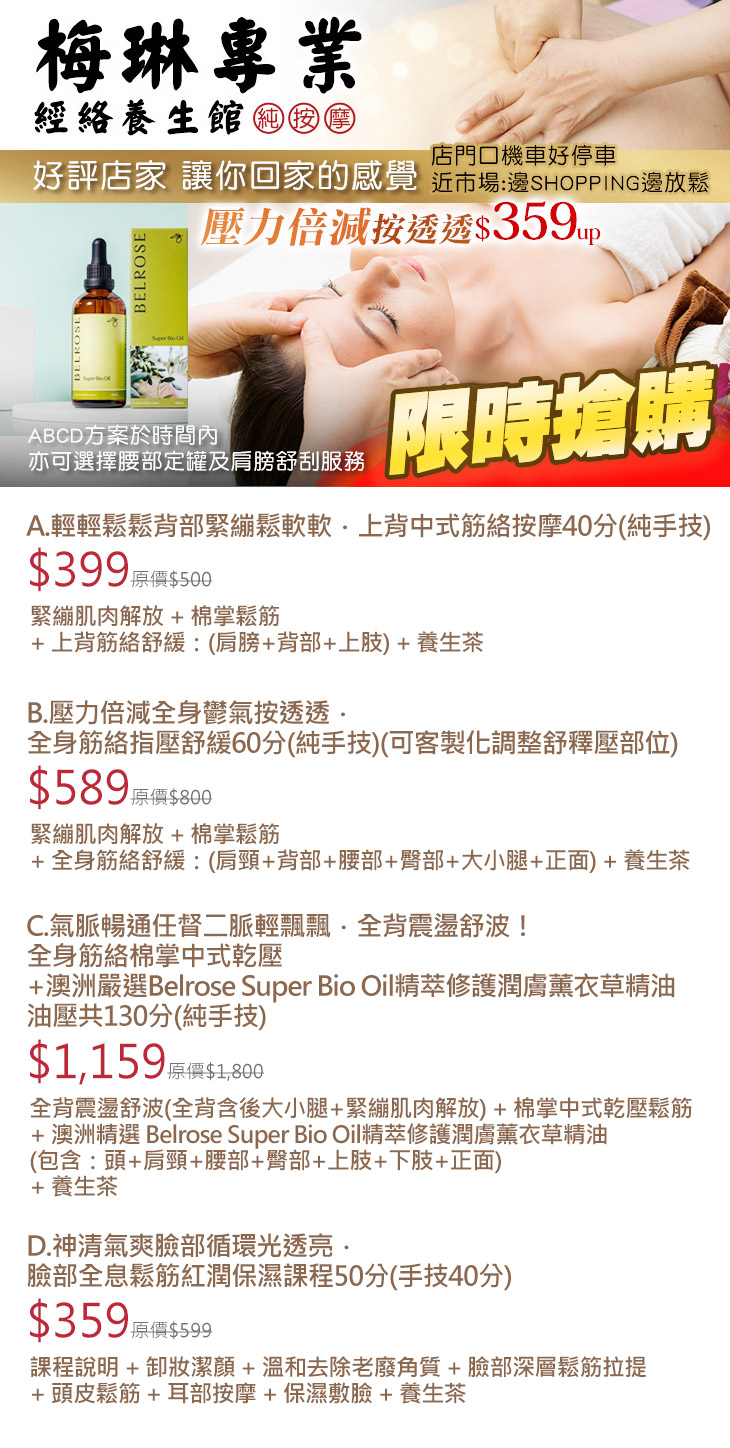 A.輕輕鬆鬆背部緊繃鬆軟軟.上背中式筋絡按摩40分(純手技) / B.壓力倍減全身鬱氣按透透.全身筋絡指壓舒緩60分(純手技)(可客製化調整舒釋壓部位) / C.氣脈暢通任督二脈輕飄飄.全背震盪舒波!全身筋絡棉掌中式乾壓+澳洲嚴選Belrose Super Bio Oil精萃修護潤膚薰衣草精油油壓共130分(純手技) / D.神清氣爽臉部循環光透亮.臉部全息鬆筋紅潤保濕課程50分(手技40分)