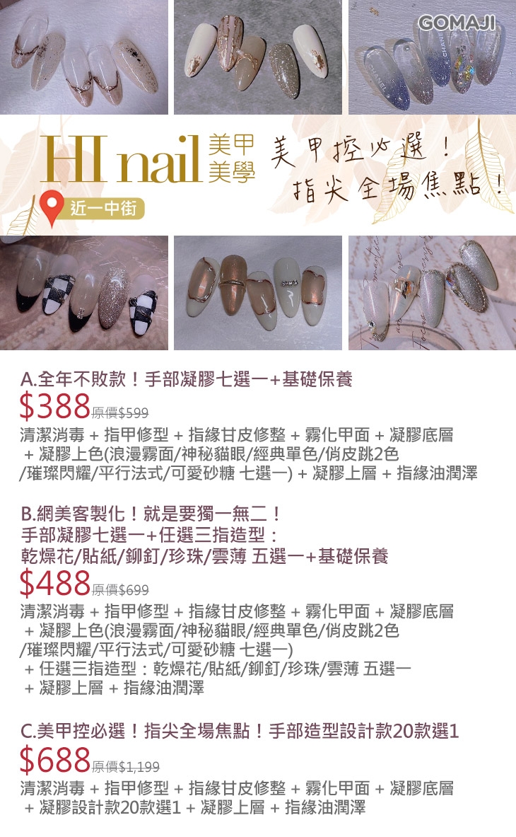 A.全年不敗款!手部凝膠七選一+基礎保養 / B.網美客製化!就是要獨一無二!手部凝膠七選一+任選三指造型:乾燥花/貼紙/鉚釘/珍珠/雲薄 五選一+基礎保養 / C.美甲控必選!指尖全場焦點!手部造型設計款20款選1
