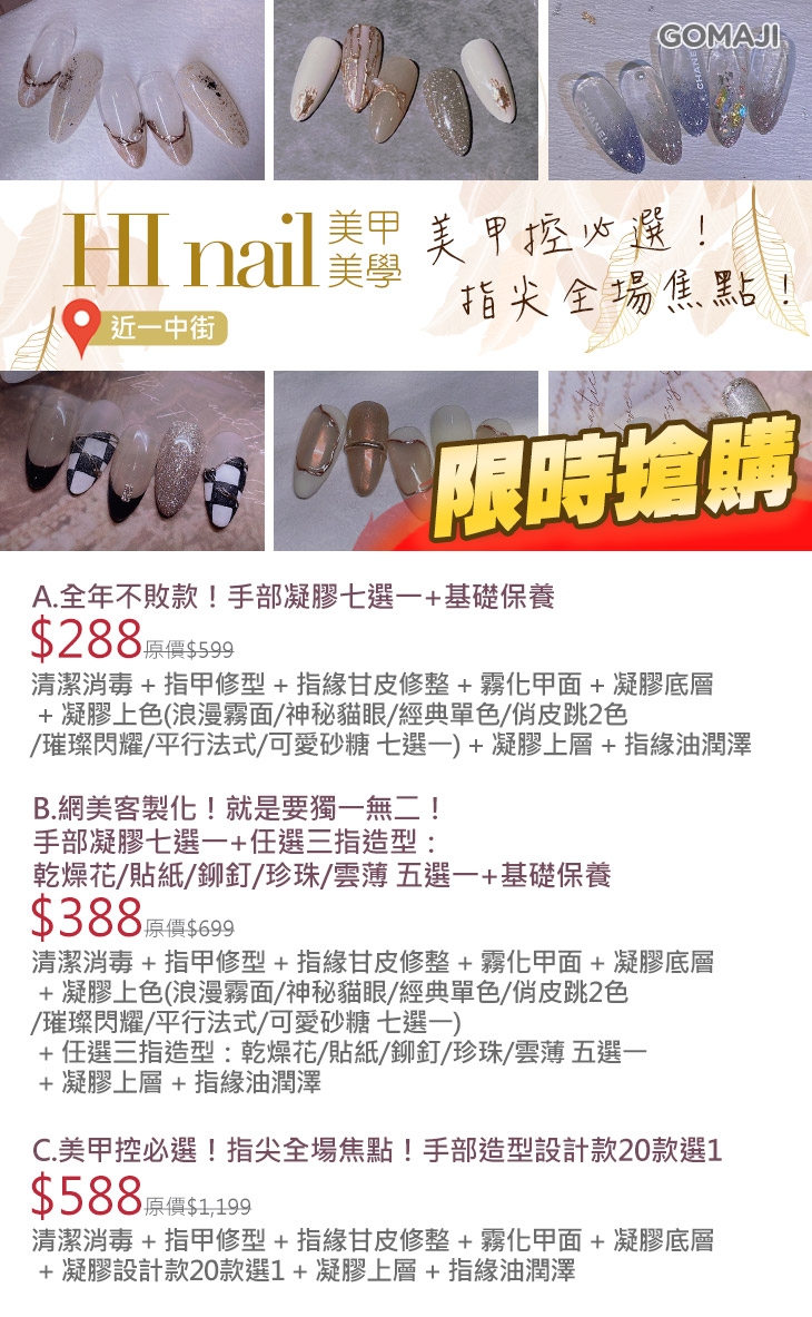 A.全年不敗款!手部凝膠七選一+基礎保養 / B.網美客製化!就是要獨一無二!手部凝膠七選一+任選三指造型:乾燥花/貼紙/鉚釘/珍珠/雲薄 五選一+基礎保養 / C.美甲控必選!指尖全場焦點!手部造型設計款20款選1