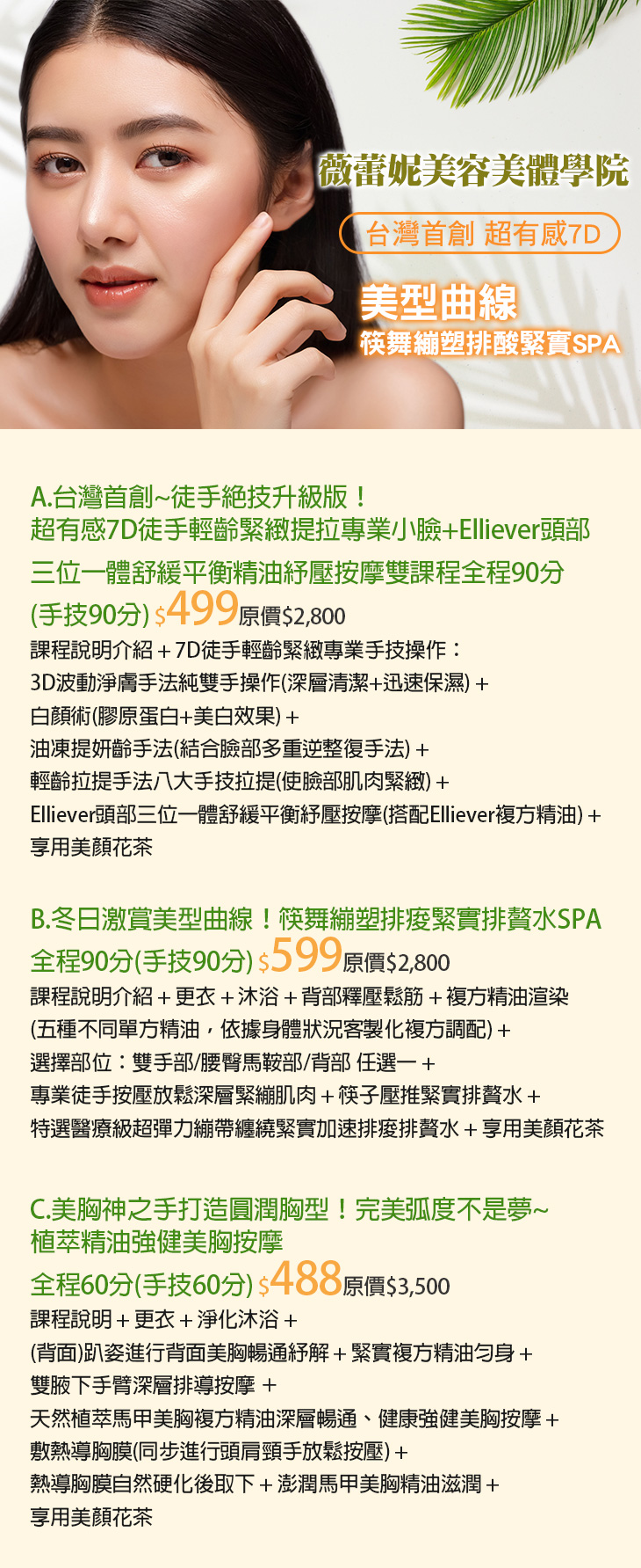 A.台灣首創~徒手絕技升級版!超有感7D徒手輕齡緊緻提拉專業小臉+Elliever頭部三位一體舒緩平衡精油紓壓按摩雙課程全程90分(手技90分) / B.冬日激賞美型曲線!筷舞繃塑排痠緊實排贅水SPA全程90分(手技90分) / C.美胸神之手打造圓潤胸型!完美弧度不是夢~植萃精油強健美胸按摩全程60分(手技60分)
