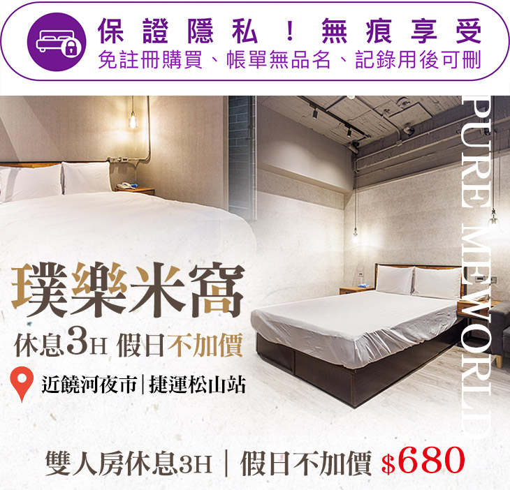 位於松山區繁華的商業地帶,鄰近於知名的饒河夜市與捷運松山站,交通非常便利,生活機能也相當方便。【台北璞樂米窩】在喧囂的市區中,為您提供一處舒適且隱約私密的空間,讓您在繁忙的工作中,暫時卸下疲憊、壓力,盡情放鬆、休息一番的好處所。