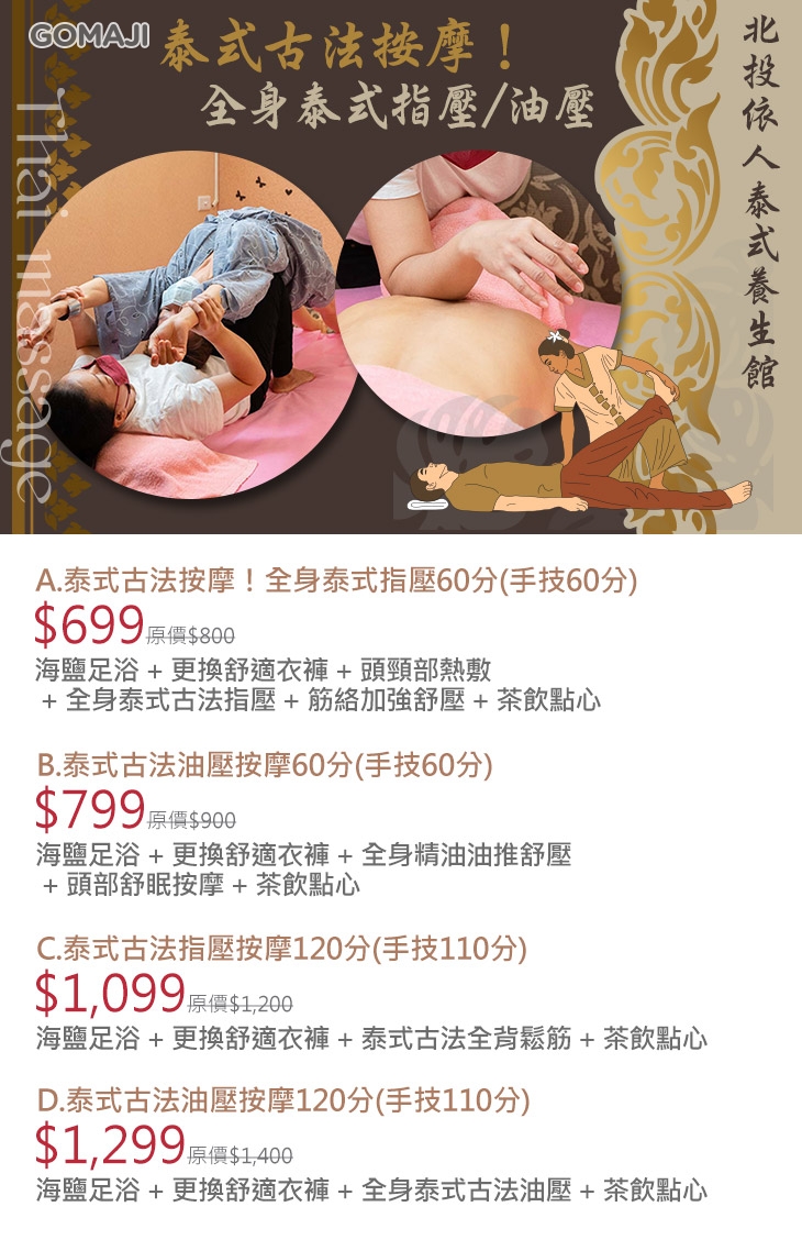 A.泰式古法按摩!全身泰式指壓60分(手技60分) / B.泰式古法油壓按摩60分(手技60分) / C.泰式古法指壓按摩120分(手技110分) / D.泰式古法油壓按摩120分(手技110分)
