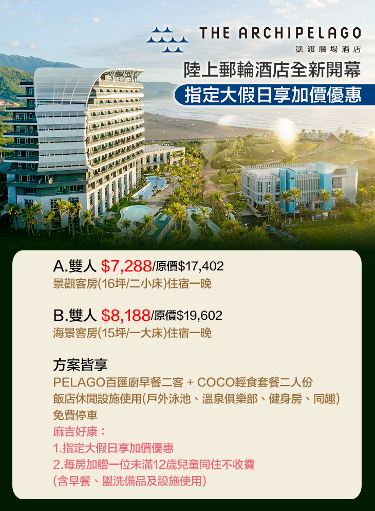 ★ 指定大假日享加價優惠:8/11(五)、8/18(五)、8/25(五),現省1400元起,幸運日搶房、手腳要快!
