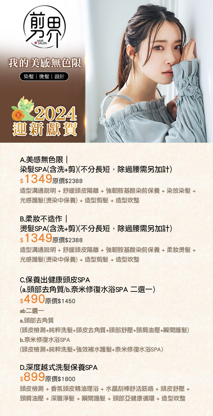A.美感無色限|染髮SPA(含洗+剪)(不分長短,除過腰需另加計) / B.柔妝不造作|燙髮SPA(含洗+剪)(不分長短,除過腰需另加計) / C.保養出健康頭皮SPA(a.頭部去角質/b.奈米修復水浴SPA 二選一) / D.深度越式洗髮保養SPA