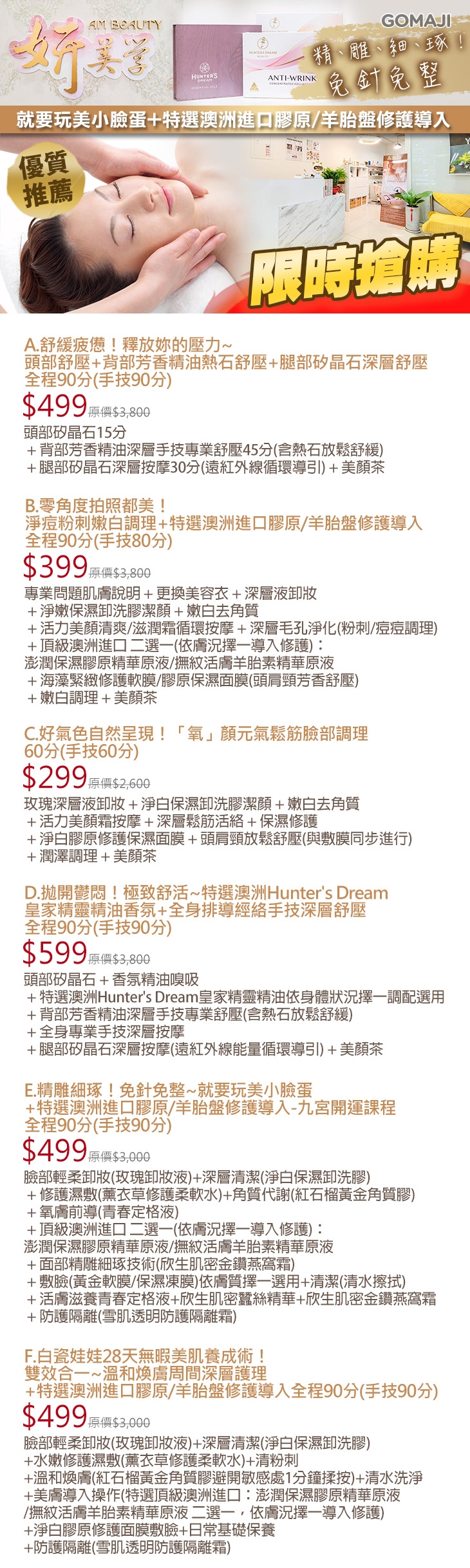 A.頭部舒壓+背部芳香精油熱石舒壓+腿部矽晶石深層舒壓全程90分/B.淨痘粉刺嫩白調理+特選澳洲進口膠原/羊胎盤修護導入全程90分/C.「氧」顏元氣鬆筋臉部調理60分/D.特選澳洲Hunter's Dream皇家精靈精油香氛+全身排導經絡手技深層舒壓全程90分/E.就要玩美小臉蛋+特選澳洲進口膠原/羊胎盤修護導入-九宮開運課程全程90分/F.溫和煥膚周間深層護理+特選澳洲進口膠原/羊胎盤修護導入全程90分