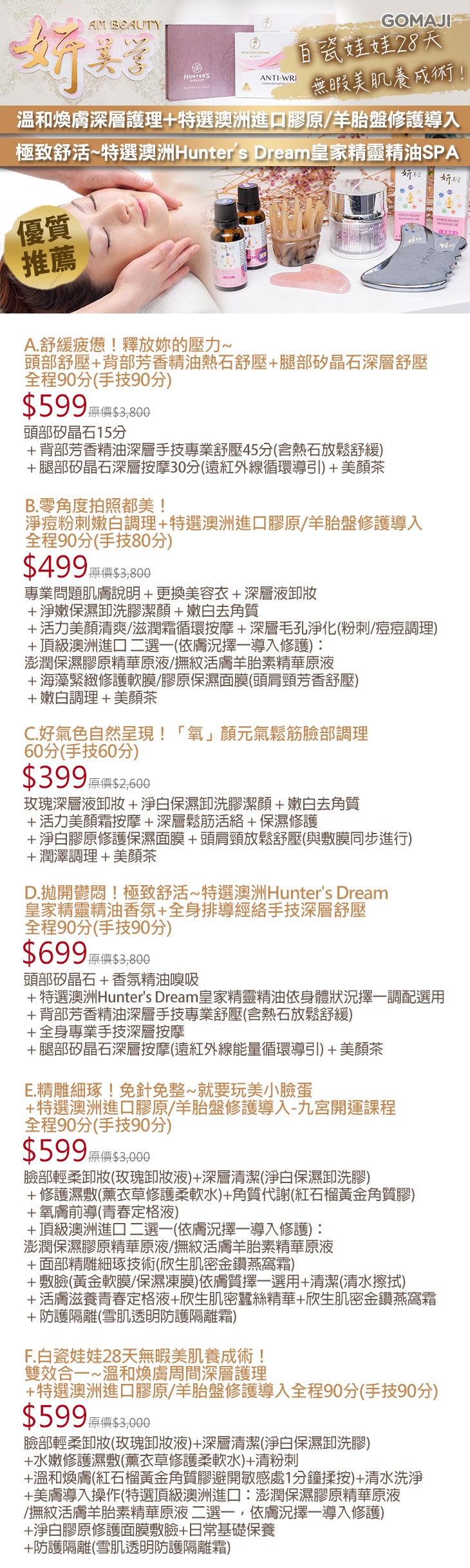 A.頭部舒壓+背部芳香精油熱石舒壓+腿部矽晶石深層舒壓全程90分/B.淨痘粉刺嫩白調理+特選澳洲進口膠原/羊胎盤修護導入全程90分/C.「氧」顏元氣鬆筋臉部調理60分/D.特選澳洲Hunter's Dream皇家精靈精油香氛+全身排導經絡手技深層舒壓全程90分/E.就要玩美小臉蛋+特選澳洲進口膠原/羊胎盤修護導入-九宮開運課程全程90分/F.溫和煥膚周間深層護理+特選澳洲進口膠原/羊胎盤修護導入全程90分