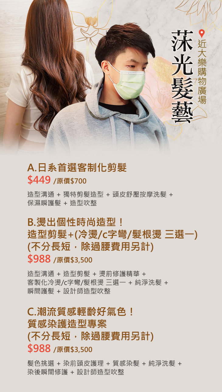 A.日系首選客制化剪髮 / B.燙出個性時尚造型!造型剪髮+(冷燙/c字彎/髮根燙 三選一)(不分長短,除過腰費用另計) / C.潮流質感輕齡好氣色!質感染護造型專案(不分長短,除過腰費用另計)
