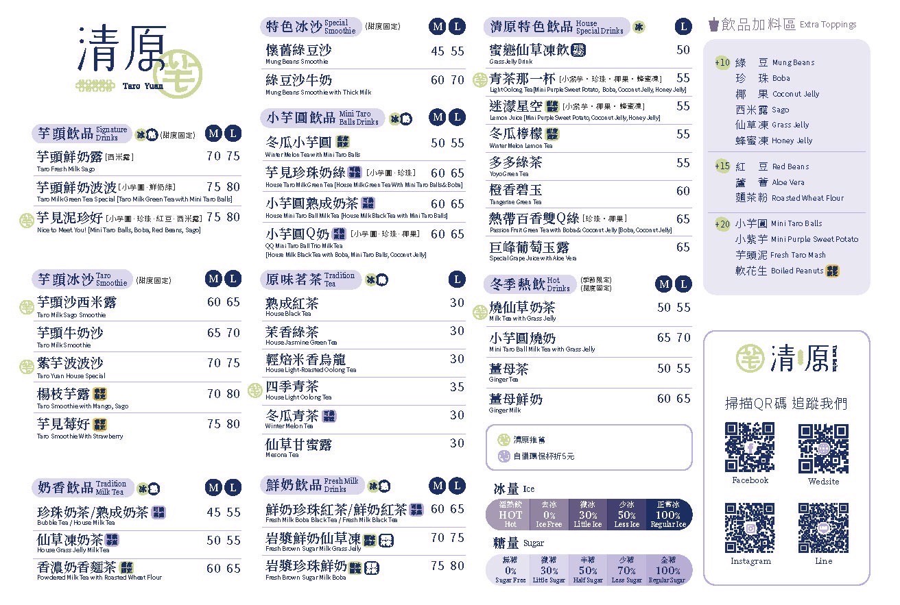 清原芋圓主打手工芋圓、湯圓、冰品、仙草、芋頭招牌飲品、台灣茶類等品項,一年四季都能滿足饕客欲求不滿的味蕾!滿滿的配料是它的一大特色~堅持使用天然的食材,重視反璞歸真的台灣味,本著對甜品與飲料的熱情,用心投入專研,並且從失敗中改進,做出專屬於清原芋圓的特色口味!喜愛芋頭的麻吉們趕快把握優惠快去品嘗料多實在的冰品,還有各式純茶及奶類可選,去就對了!
