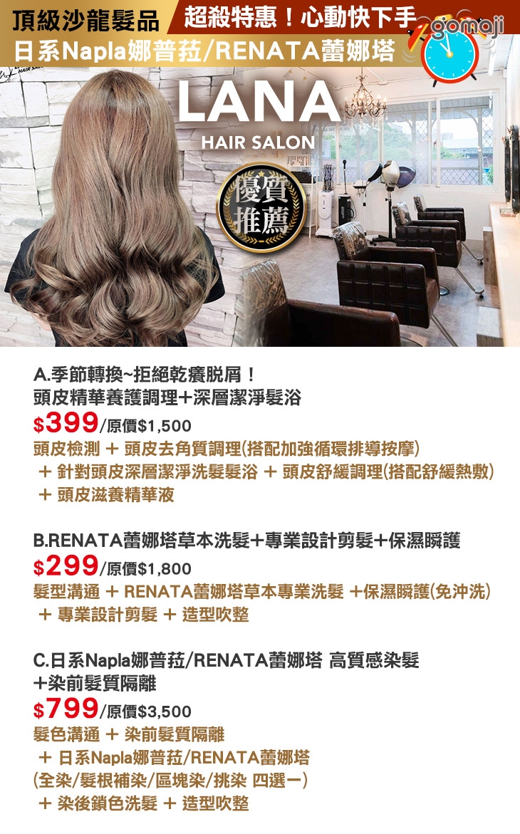 A.季節轉換~拒絕乾癢脫屑!頭皮精華養護調理+深層潔淨髮浴 / B.RENATA蕾娜塔草本洗髮+專業設計剪髮+保濕瞬護 / C.日系Napla娜普菈/RENATA蕾娜塔 高質感染髮+染前髮質隔離