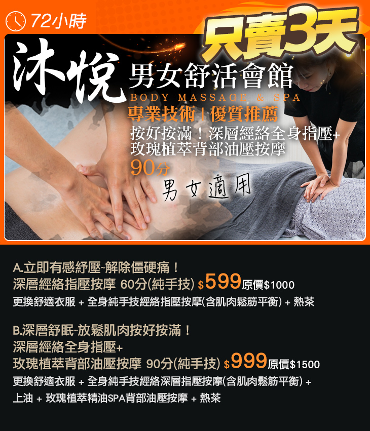 A.立即有感紓壓~解除僵硬痛!深層經絡指壓按摩 60分(純手技) / B.深層舒眠~放鬆肌肉按好按滿!深層經絡全身指壓+玫瑰植萃背部油壓按摩 90分(純手技)