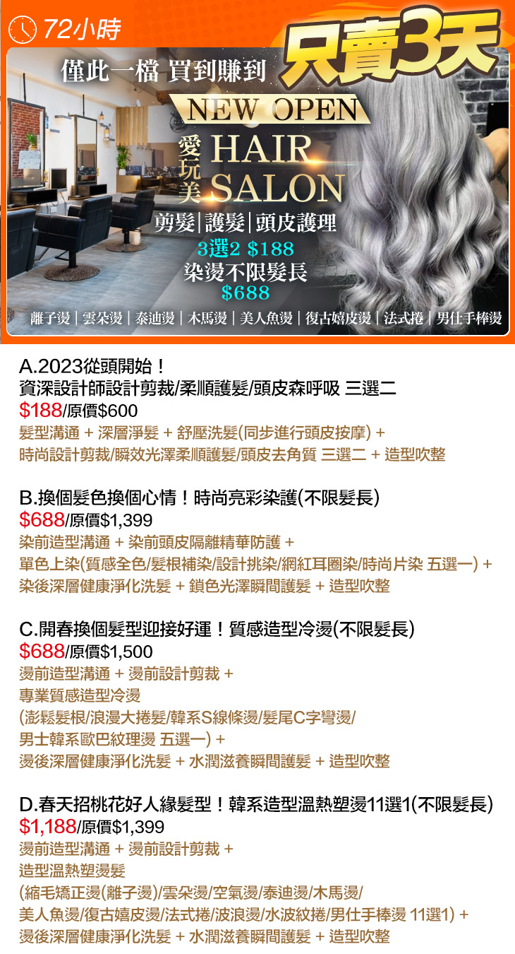 A.2023從頭開始!資深設計師設計剪裁/柔順護髮/頭皮森呼吸 三選二 / B.換個髮色換個心情!時尚亮彩染護(不限髮長) / C.開春換個髮型迎接好運!質感造型冷燙(不限髮長) / D.春天招桃花好人緣髮型!韓系造型溫熱塑燙11選1(不限髮長)