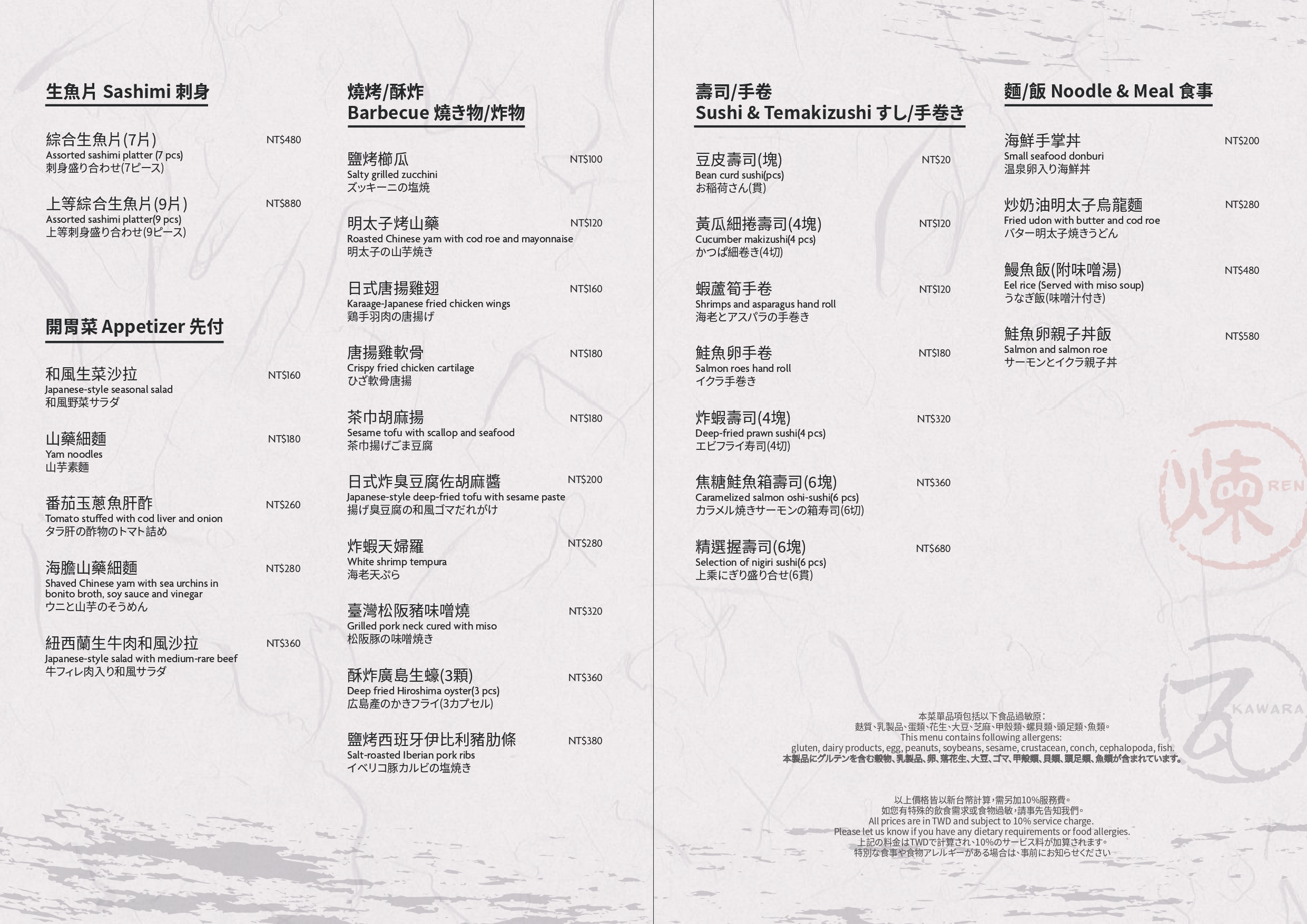 時令鮮魚,經主廚俐落的刀工切片鋪再粒粒分明的飯上,平滑的橫切面,讓您能充分咀嚼魚肉的彈性與柔嫩,沾些許山葵享用,讓其辛嗆的風味襯托引出魚肉的鮮甜,高級細緻的口感,讓人擁有奢華享受。