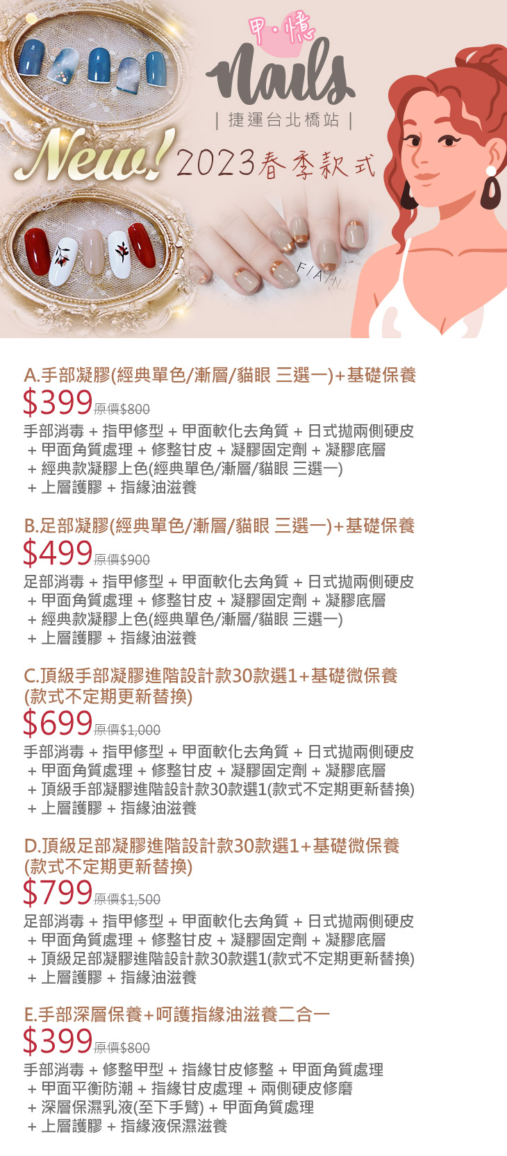 A.手部凝膠(經典單色/漸層/貓眼 三選一)+基礎保養 / B.足部凝膠(經典單色/漸層/貓眼 三選一)+基礎保養 / C.頂級手部凝膠進階設計款30款選1+基礎微保養(款式不定期更新替換) / D.頂級足部凝膠進階設計款30款選1+基礎微保養(款式不定期更新替換) / E.手部深層保養+呵護指緣油滋養二合一