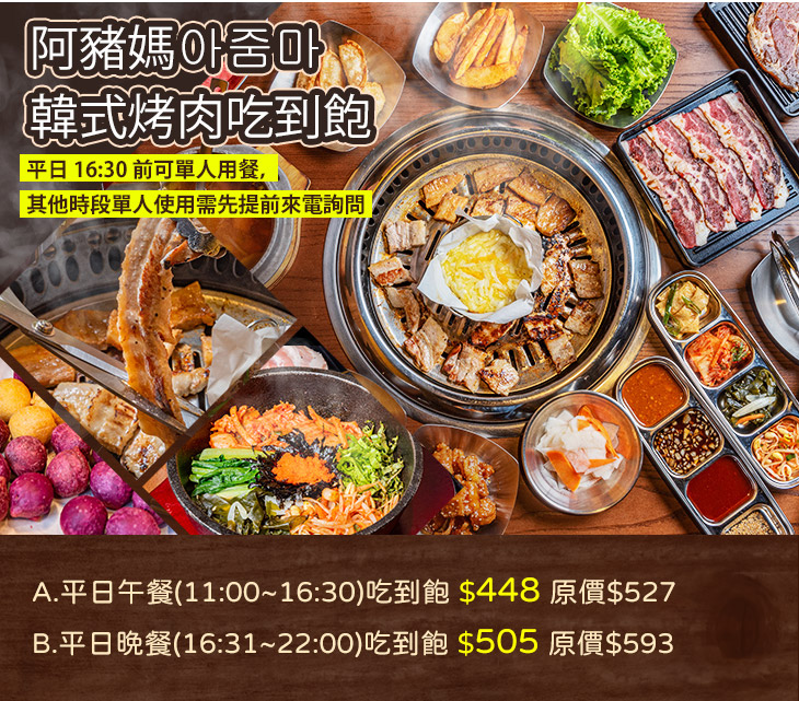 超人氣韓式烤肉吃到飽餐廳登場!深受〝韓料迷〞青睞的【阿豬媽아줌마韓式烤肉吃到飽】,主打正宗道地、料多實在的韓式烤肉,除了精挑細選的食材用料,純正的韓式調味,讓您細細品味來自韓國的美好,大呼過癮!