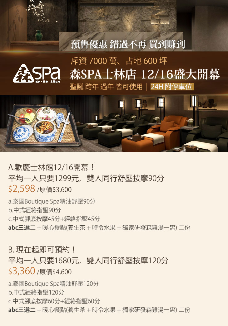 A.歡慶士林館12/16開幕!平均一人只要1299元,雙人同行舒壓按摩90分 / B. 現在起即可預約!平均一人只要1680元,雙人同行舒壓按摩120分