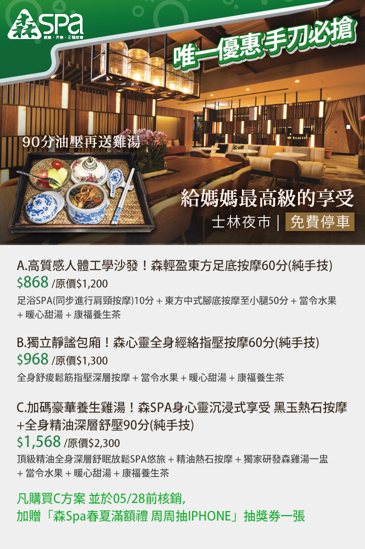 〈頂級精油全身深層舒眠放鬆SPA悠旅 + 精油熱石按摩 + 獨家研發森雞湯一盅 + 當令水果 + 暖心甜湯 + 康福養生茶〉05/28前核銷,加贈「森Spa春夏滿額禮 周周抽IPHNOE」抽獎券一張