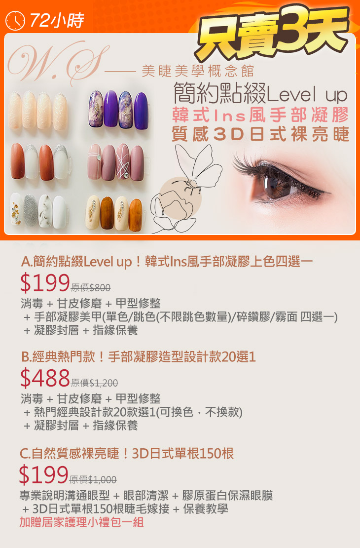 A.簡約點綴Level up!韓式Ins風手部凝膠上色四選一 / B.經典熱門款!手部凝膠造型設計款20選1 / C.自然質感裸亮睫!3D日式單根150根