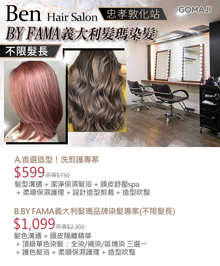使用義大利BY FAMA髮瑪優質染劑,替您的髮絲均勻地上色,同時不傷害髮質,染出一頭色澤飽和、具有質感的秀髮,讓您整個人煥然一新,成為眾人矚目的焦點。