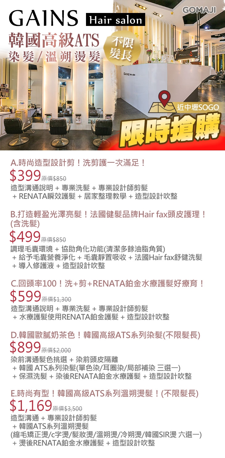 A.時尚造型設計剪!洗剪護一次滿足!/ B.打造輕盈光澤亮髮!法國健髮品牌Hair fax頭皮護理!(含洗髮) / C.回頭率100!洗+剪+RENATA鉑金水療護髮好療育!/ D.韓國歐膩奶茶色!韓國高級ATS系列染髮(不限髮長) / E.時尚有型!韓國高級ATS系列溫朔燙髮!(不限髮長)