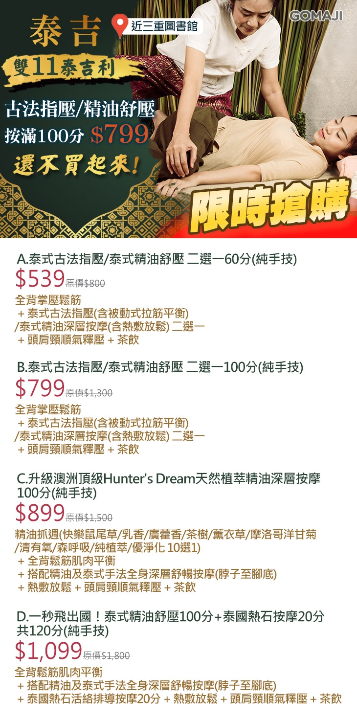 A.泰式古法指壓/泰式精油舒壓 二選一60分(純手技) / B.泰式古法指壓/泰式精油舒壓 二選一100分(純手技) / C.升級澳洲頂級Hunter's Dream天然植萃精油深層按摩100分(純手技) / D.一秒飛出國!泰式精油舒壓100分+泰國熱石按摩20分共120分(純手技)