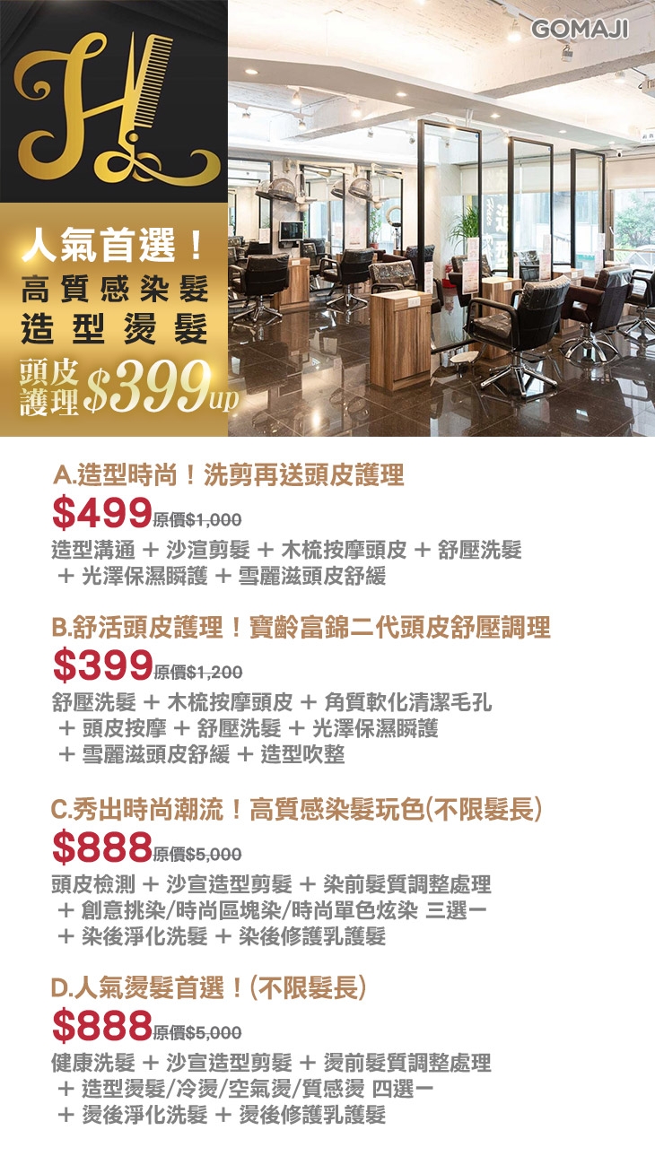 A.造型時尚!洗剪再送頭皮護理 / B.舒活頭皮護理!寶齡富錦二代頭皮舒壓調理 / C.秀出時尚潮流!高質感染髮玩色(不限髮長) / D.人氣燙髮首選!(不限髮長)