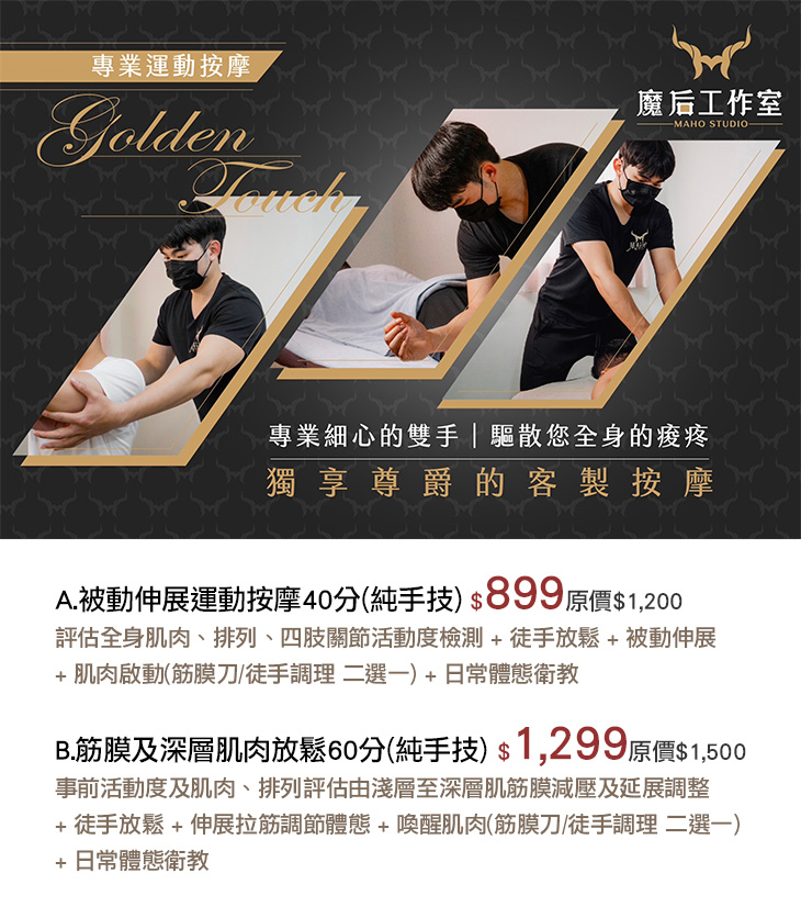 〈評估全身肌肉、排列、四肢關節活動度檢測 + 徒手放鬆 + 被動伸展 + 肌肉啟動(筋膜刀/徒手調理 二選一) + 日常體態衛教〉
